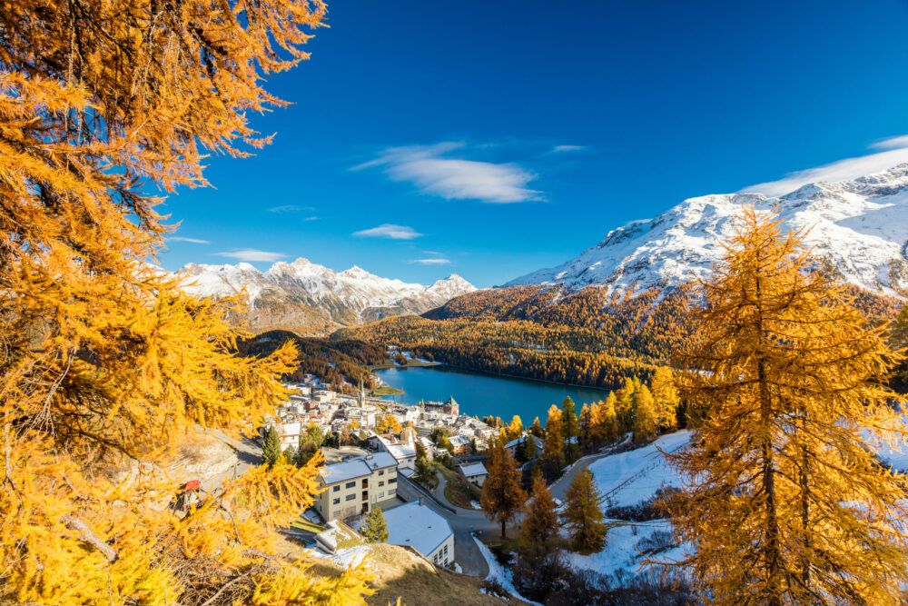 Pictures from top: winter view of St Moritz at dusk (Getty); Chalet Telemark in Villars, outside and in; the autumn colours of Graubunden, Switzerland (Alamy)