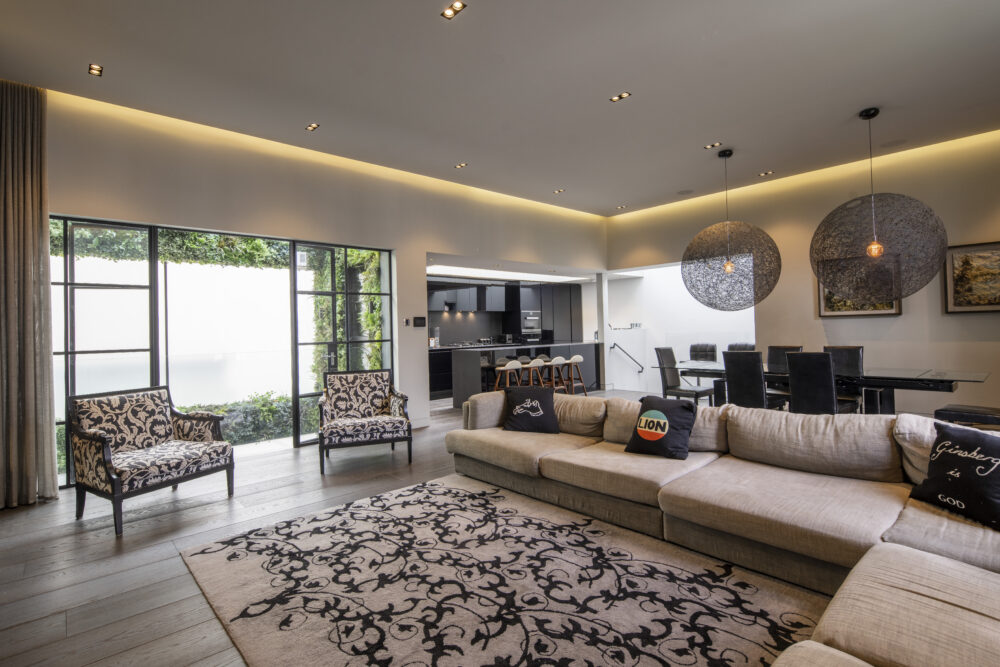 This five bedroom home is defined by its dramatic proportions and seamless integration of indoor and outdoor living. The centrepiece is a magnificent principal reception room measuring over 33 ft by 29 ft, with grand volumes and full-height floor to ceiling glazing that opens onto a stunning internal garden a tranquil focal point that brings natural light and greenery into the heart of the home.