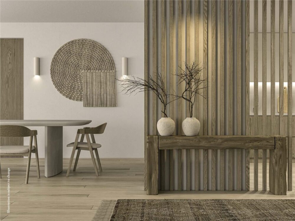 woods, stone, and organic textiles to foster a seamless connection with nature.
