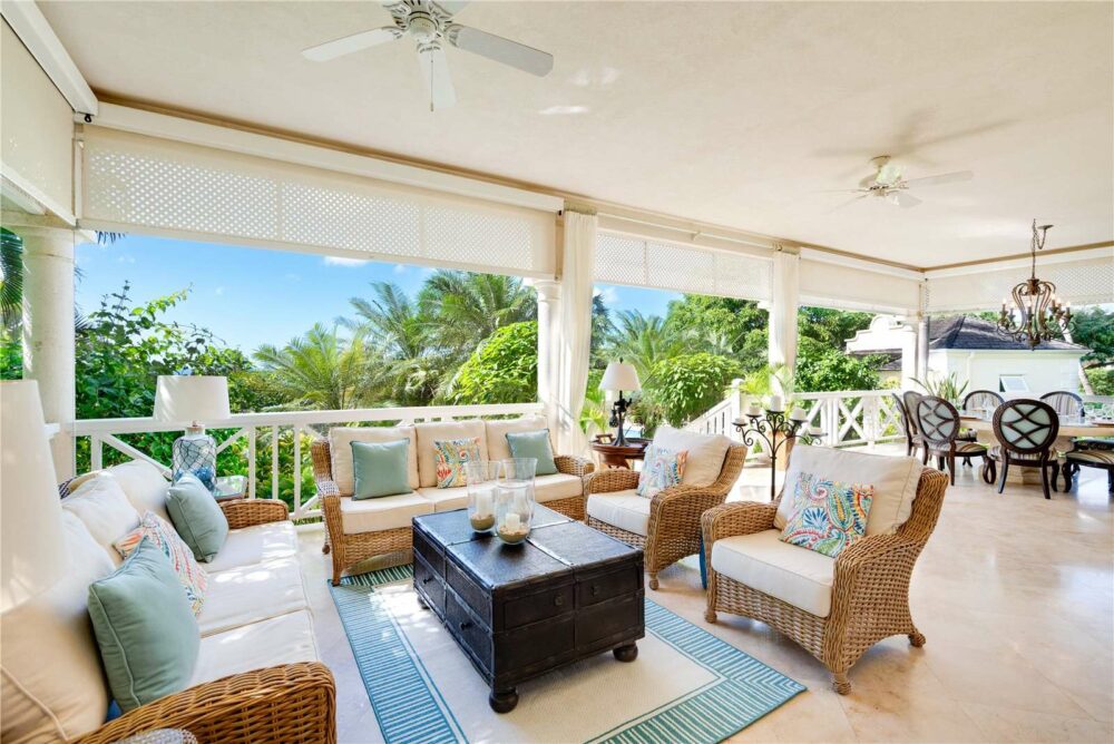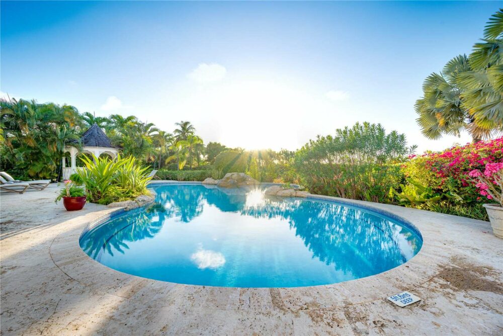 On entering Calliaqua, you are first met by the high ceilings of the elegant entry and living room, where the luxury standard of finishes are immediately apparent in the coral rendered walls and marble tiled floors. This space opens onto the large covered terrace, featuring comfortable sofas and an impressive coral stone dining table, perfect for outdoor living. It is here that meals are enjoyed, drinks are imbibed and friends and family gather. The expansive pool, surrounding deck and vibrant, fragrant and mature gardens form the backdrop to the terrace. At one end of the pool deck is the charming 1 bedroom, ensuite guest cottage and mirroring it at the other is a delightful gazebo.
