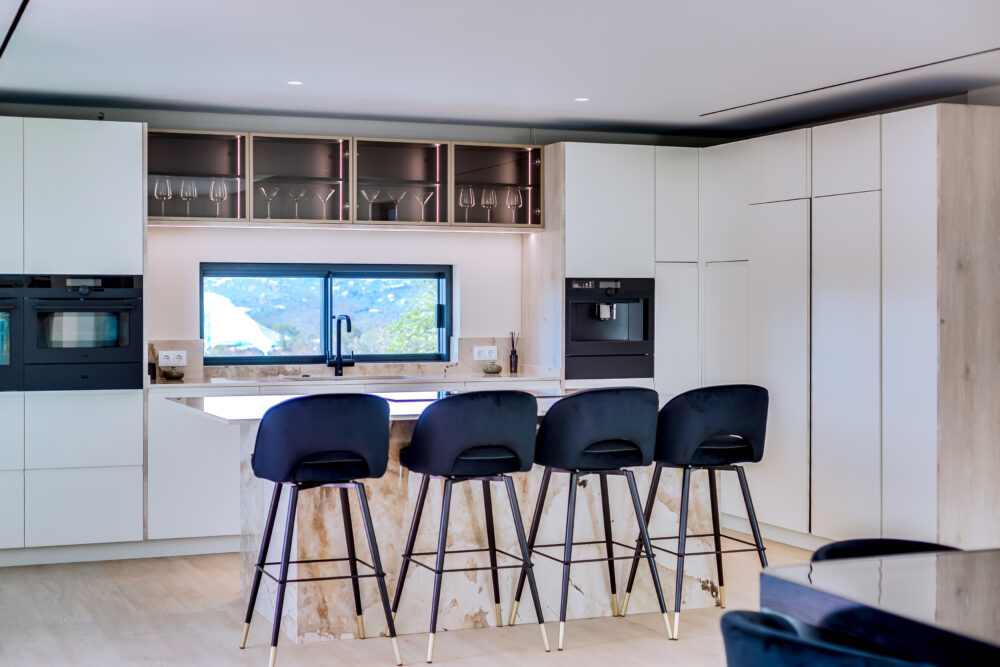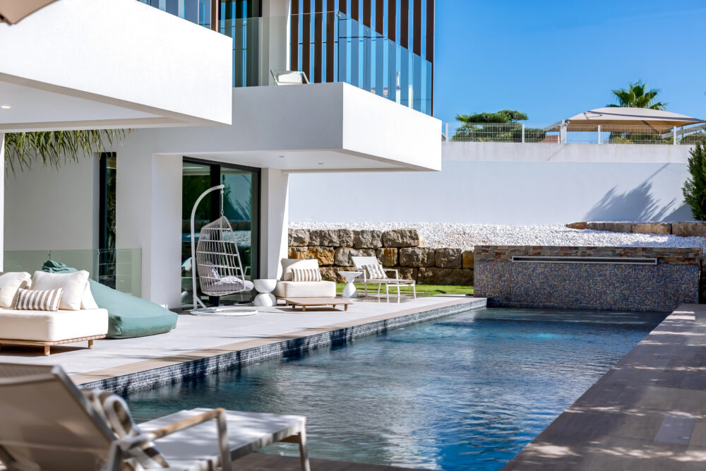 Four ensuite bedrooms, distributed across the three levels, include a luxurious primary suite with a freestanding tub and private terrace, providing comfort and privacy for family and guests. The lower level offers versatile space, a guest bathroom, laundry room and a two-car garage. A saltwater swimming pool with a water feature and an outdoor kitchen make this home ideal for entertaining and relaxation. With close proximity to Vilamoura, Quinta do Lago and Vale do Lobo, the villa combines modern living with access to the Algarve’s finest amenities.
