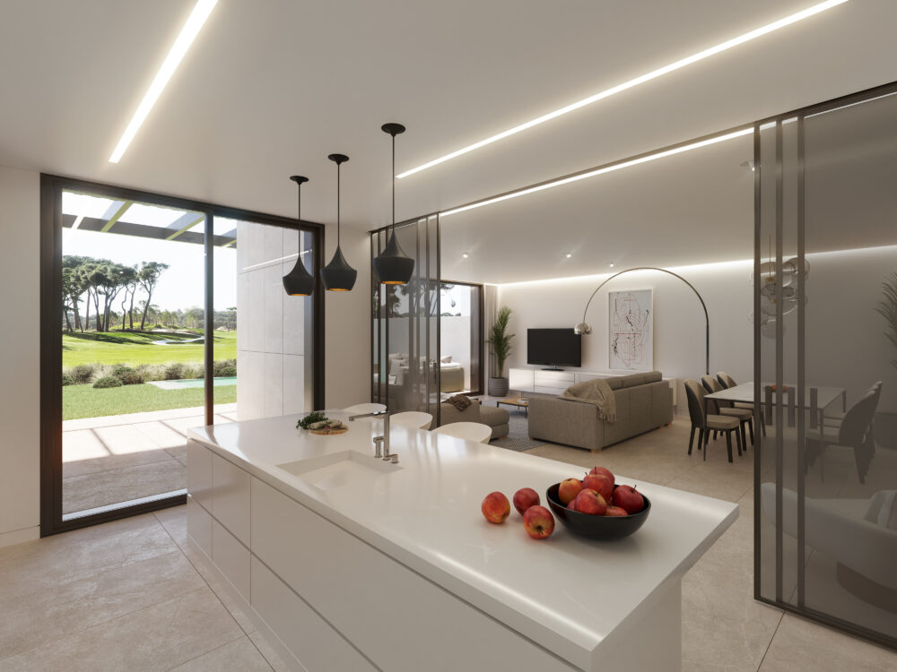 On the ground floor, the home is organized around a landscaped patio that brings light and privacy to every space. The spacious south-facing living room opens onto the private garden, offering a direct connection to the golf course views.