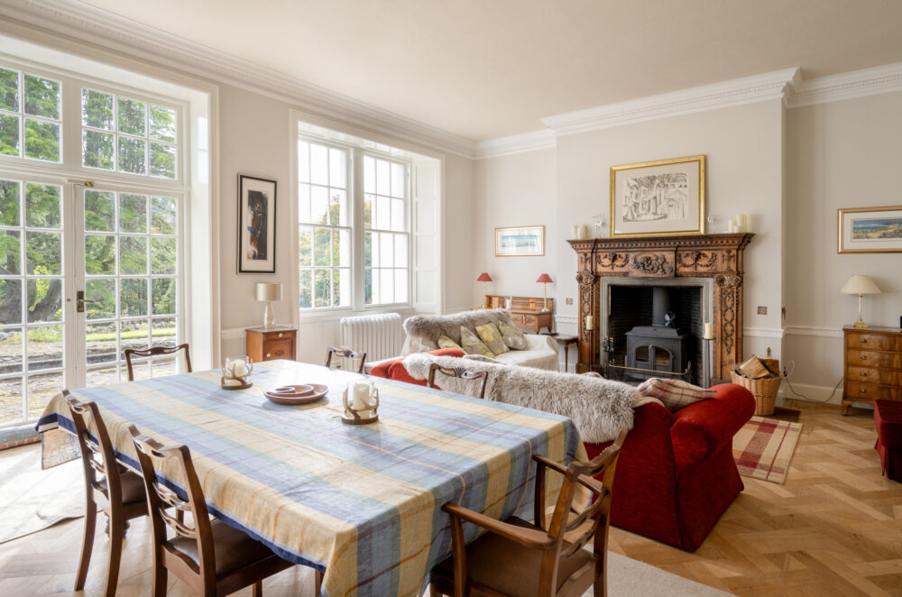 A magnificent entrance hall welcomes you into the home, with an attractive, broad wooden staircase sweeping up to the landing above, and setting the tone for the generous proportions and abundance of natural light throughout. The ground floor boasts five impressive reception rooms, including a drawing room, dining room, library / sitting room, billiard room and a recently renovated conservatory with arched windows offering panoramic views across the gardens and towards the loch. The spectacular drawing room is the pick of these rooms. It has original parquet flooring, a log burning stove with a decorative timber mantel, and French doors which open directly to a south-facing terrace, perfect for outdoor entertaining. The spacious kitchen / breakfast room is fitted with integrated cabinetry, and appliances that include a range cooker. Practical spaces such as a walk-in gun safe, cloakroom and storeroom further enhance the home’s functionality.