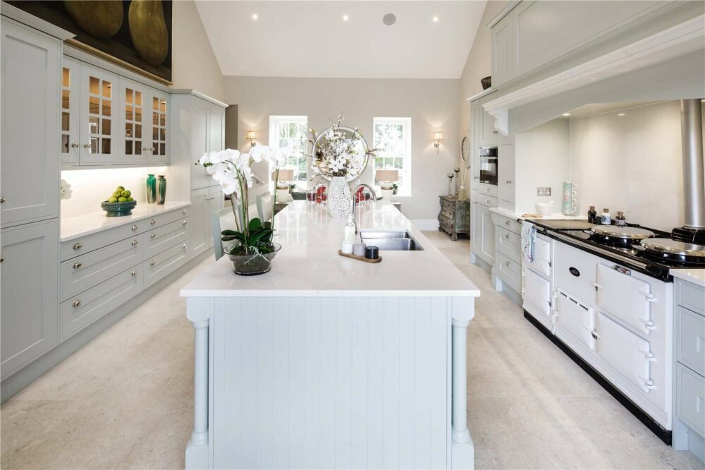 The luxurious converted two-bedroom en-suite guest cottage, in the same neutral and luxurious colour palette. Substantial in size the guest house has an open plan kitchen and sitting room with a romantic Juliet balcony that overlooks the grounds and swimming pool. Next to the pool there is also a self-contained pool house which contains a full kitchen, changing and shower facilities with inbuilt Sonos to the exterior walls making for fun pool parties. The pool itself has been completely refurbished with new contemporary lighting.