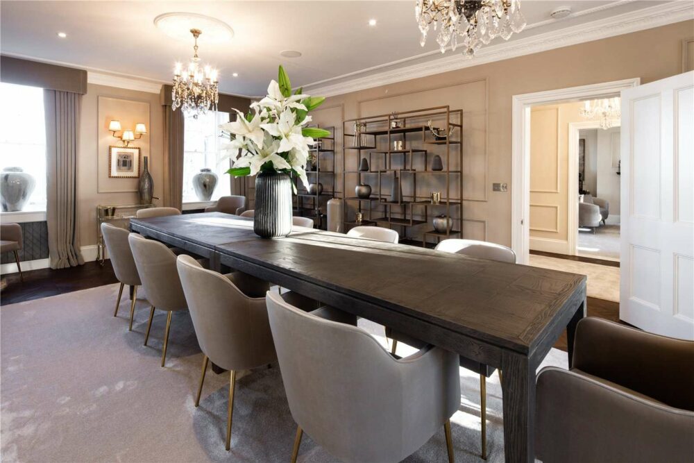 The rich dark flooring continues into a formal drawing room and large dining room, finished with luxurious fabrics, elegant rugs and a wonderful collection of antiques strategically placed to make use of the space. The sumptuous colour scheme contains splashes of colour, bold and brave but not too much. Their choice of accessories and sculptures always completes their interior vision and provides an instantaneous homely feel.