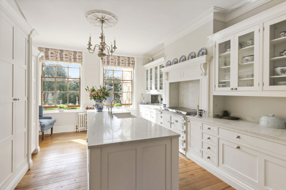 The traditionally-styled drawing room has a wealth of original features together with natural charm, character and warmth. Notably light and airy, it has an open fire with stone surround, bespoke cabinetry to either side and full-height windows. Of note is the impressively-designed sunken television unit which sits within the cabinetry: remotely operated, it appears at your discretion. The formal dining room affords the ideal place to host social-gatherings. The delightful garden room/snug has French doors opening to the sun terrace and is of particular charm with dedicated views over the Mediterranean-styled garden. In addition there is a utility room and a well-appointed cloakroom.