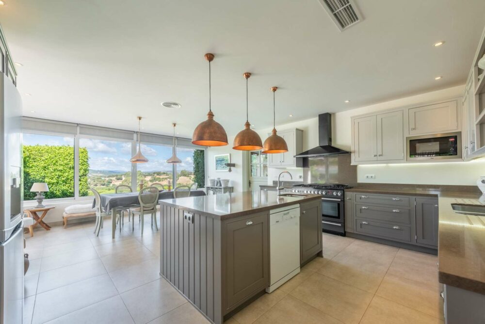 The house faces west and looks across a valley with stunning views often accentuated by spectacular sunsets and, as you enter, its great charm strikes you immediately. The house measures 471m2 with five bedrooms with ensuite bathrooms, a living room with fireplace which leads out to a terrace which is enclosed by glass panels in the winter, creating a sun room which also has a central fireplace to warm the chilly evenings at that time of year. This terrace leads out to the garden and lawn and looks across the valley. There is a separate dining room with its own fireplace and a large kitchen with a pantry and adjoining laundry room. There is underfloor heating in the main living areas of the house which is served by a gas boiler which also heats the hot water system. There are air conditioning units in all the bedrooms and the house has an alarm system which is connected to the provider via its own sim card