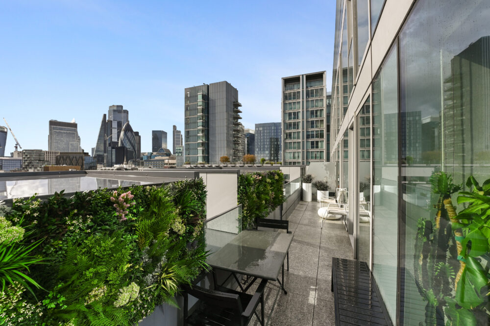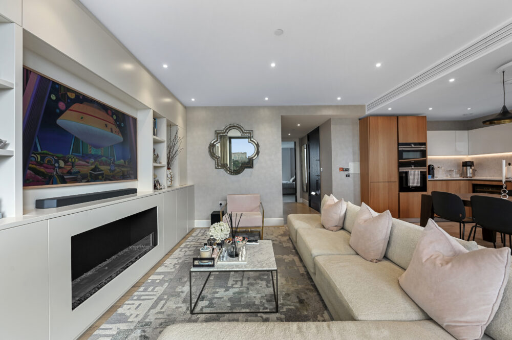 There are three bathrooms serving three double bedrooms, with both the principal and second bedrooms benefiting from built-in wardrobes and Easterly views over towards Canary Wharf.