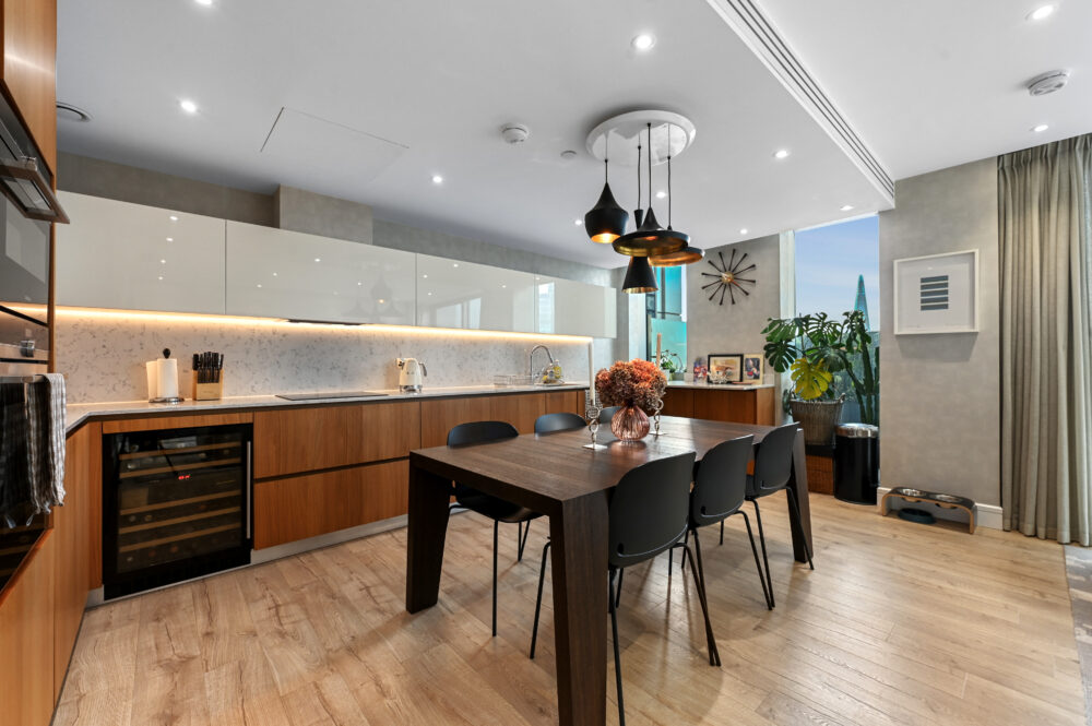 The open plan kitchen, dining and living room is awash with modern, high specification appliances. This side of the home enjoys uninterrupted Westerly views of the City.