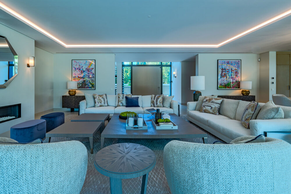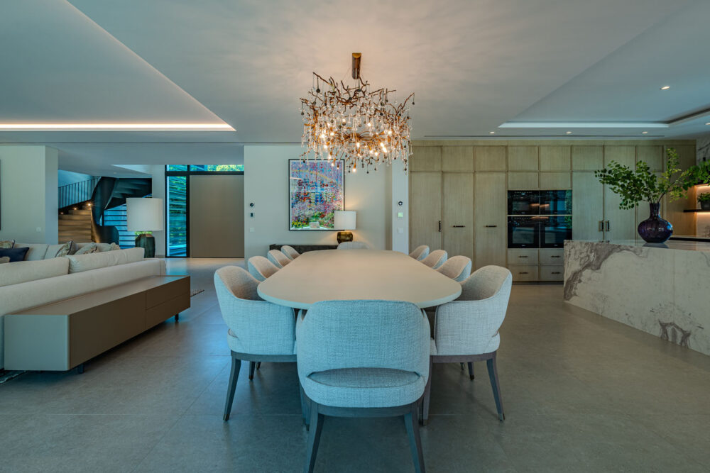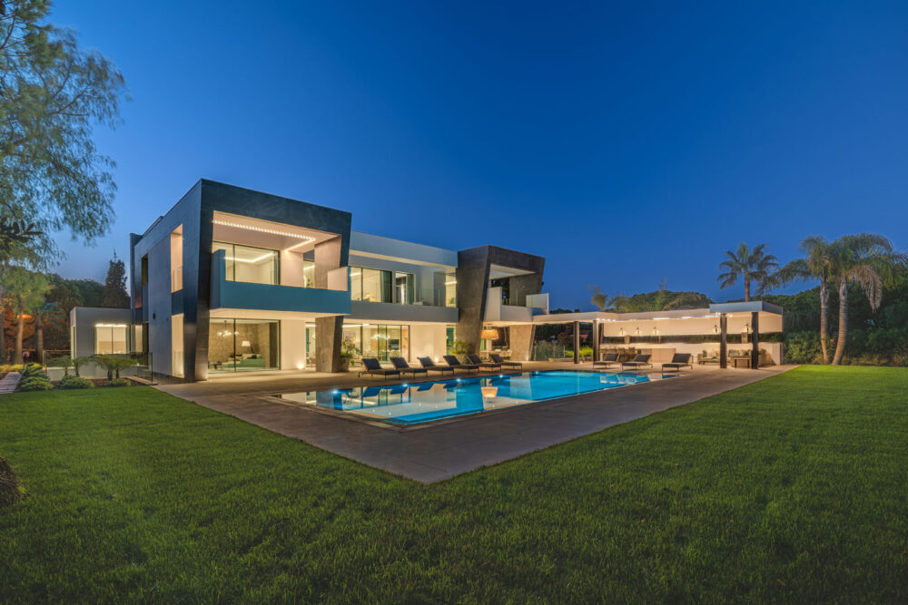 Set along the 9th hole of the prestigious São Lourenço Golf Course, this newly-built villa captures the essence of modern Quinta do Lago living, architectural precision, natural light, and elegant comfort in perfect harmony. The impressive double-height entrance opens directly into an expansive open-plan living, dining, and kitchen area where floor-to-ceiling glass floods the interior with light and frames the pool and golf course beyond. The kitchen with Miele, Leiber, and Bora appliances forms the heart of the home, while a sophisticated dining area and spacious lounge invite effortless entertaining. A separate TV room, private office, and two stylish bedroom suites complete this level, with a sculptural staircase and. Upstairs, three beautifully appointed suites offer a calm sense of privacy, including a grand master suite with an impressive walk-in wardrobe and private terrace overlooking the fairway. The lower level is dedicated to leisure and wellbeing, featuring a wine store, bar, games area, yoga and massage rooms, and direct access to a private outdoor terrace. A cinema room can be added to personal specification, and an additional guest suite ensures comfort for family and visitors alike. The rooftop terrace, complete with its own W/C, enjoys sweeping sunset views across the golf course and distant views of the sea – a tranquil retreat that captures the spirit of Quinta do Lago living at its finest.
