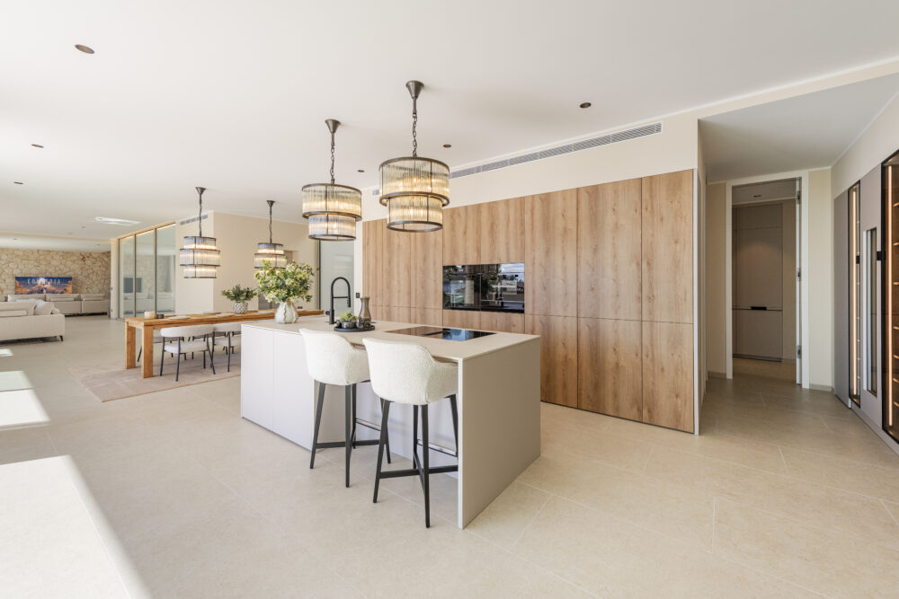 The villa offers a generous built area of around 540 m², distributed over two floors plus a basement. The interior features a bright open-plan living area, a high-quality fitted kitchen with a dining space and additional preparation kitchen, a guest toilet, and six double bedrooms, each with an en-suite bathroom, including one with a private dressing room.