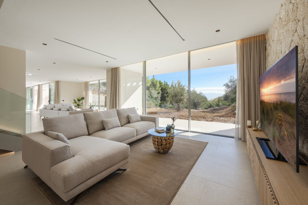 Set on an elevated southwest-facing plot of approximately 1,330 m², the property enjoys abundant sunshine and panoramic views throughout the day.