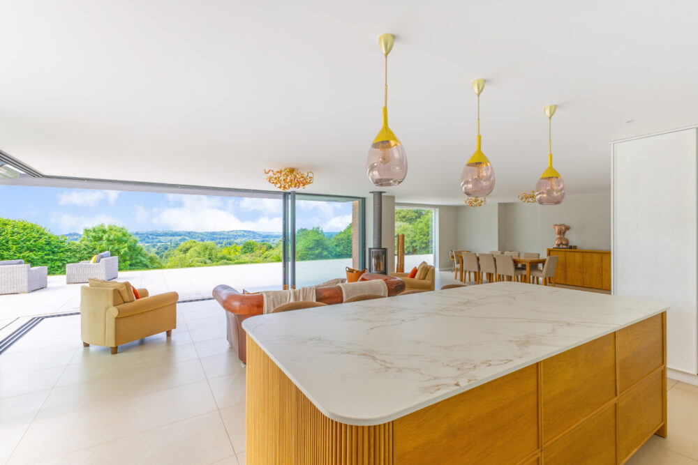 This substantial family house is immaculately presented throughout, with most of the rooms taking full advantage of the magnificent far reaching views. The accommodation flows well, with a mix of formal and informal reception space, perfect for family life. A particular highlight is undoubtedly the stunning open-plan kitchen/dining/family room, with full height corner sliding doors opening the entire space on to the extensive outside terrace. The kitchen itself is beautifully appointed with bespoke fitted cabinetry, complemented by Dekton worktops and an excellent range of integrated appliances. A large island gives additional storage and breakfast bar seating. Further features include a contemporary rotating wood burner and underfloor heating. Beyond the kitchen is a useful utility/store room, with an inner hallway leading to a boot room, shower room and through to a large games room/office, with access to the laundry room. In addition is a storage room and cold store. On the far side of the house sits a formal, triple aspect drawing room enjoying a contemporary wood burner and doors on to the terrace. Further reception space includes a TV/cinema room and an adjacent office. Completing the accommodation on this floor is a guest cloakroom.